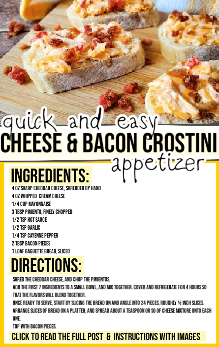 This easy pimento cheese and bacon crostini recipe is a delicious homemade pimento cheese spread on baguette slices, then topped with bacon pieces. This is a perfect no bake appetizer for any party!